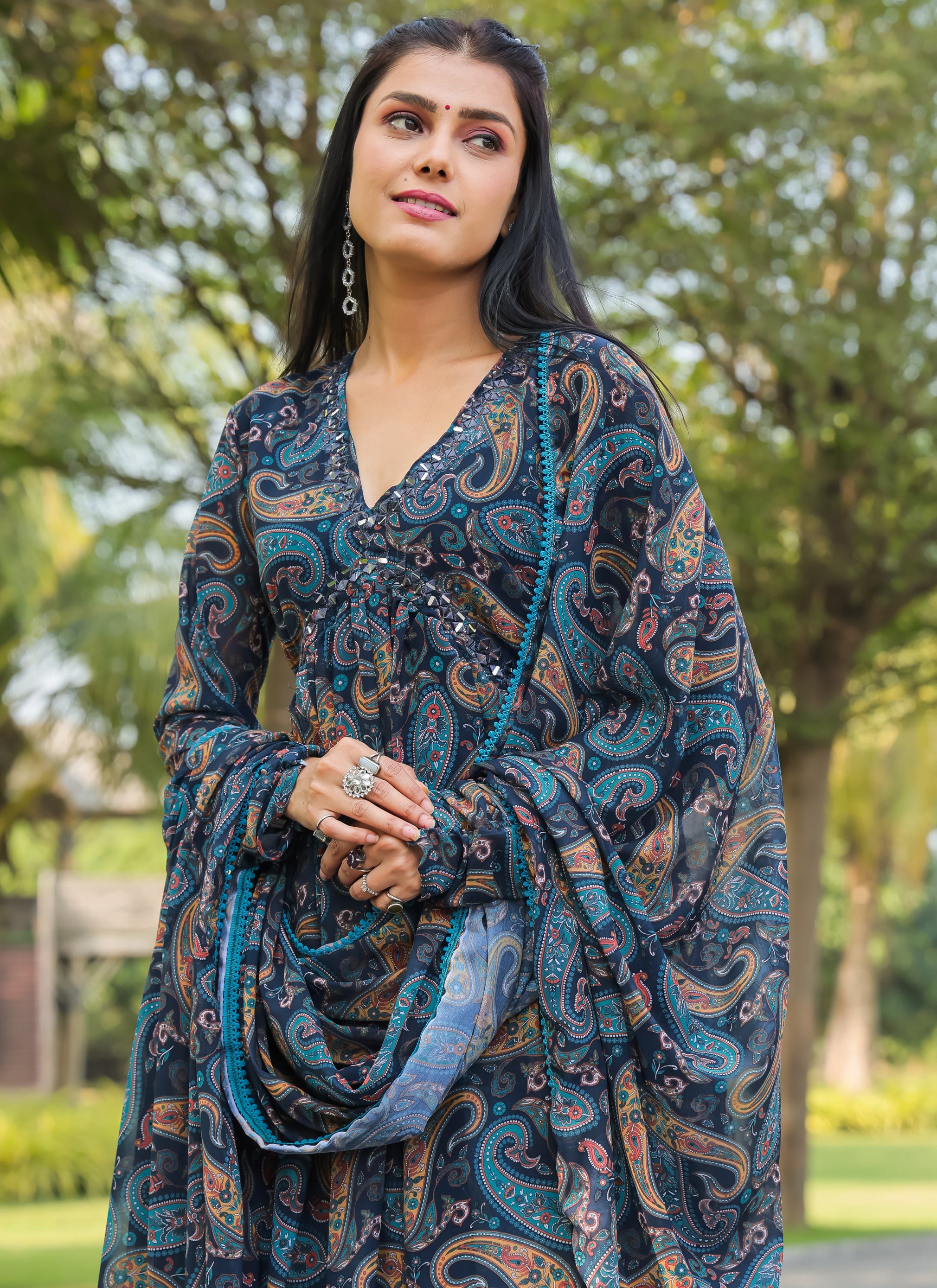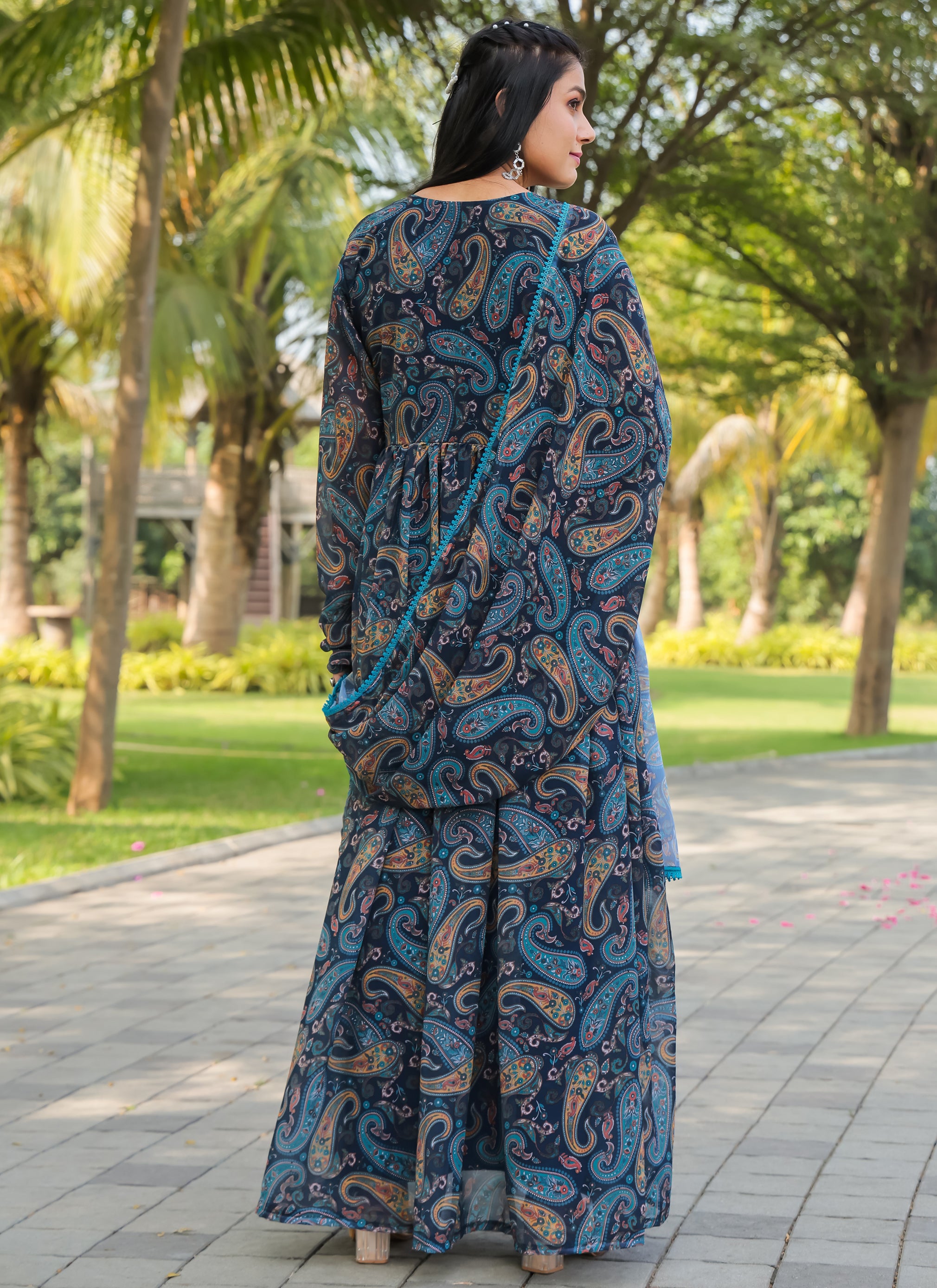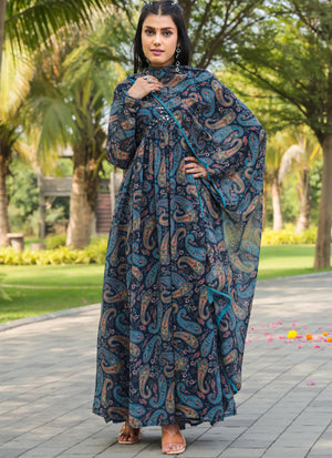 Step into elegance with this Blue Floral Printed Georgette Gown, designed with a flowing tiered silhouette and a chic round back cut-out detail. Featuring a V-neckline, full sleeves, and flared design, this gown promises both comfort and charm. Paired with a 2.25mtr dupatta, it’s the perfect attire for parties, festive celebrations, and special occasions.