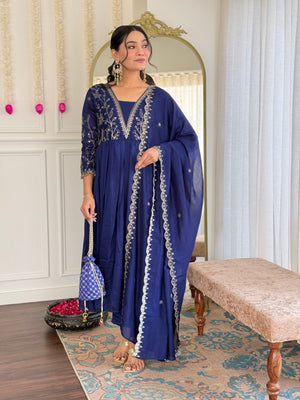 Women’s Blue Vichitra Silk Embroidered Flared Kurta with Rayon Pant & Vichitra Silk Dupatta Set