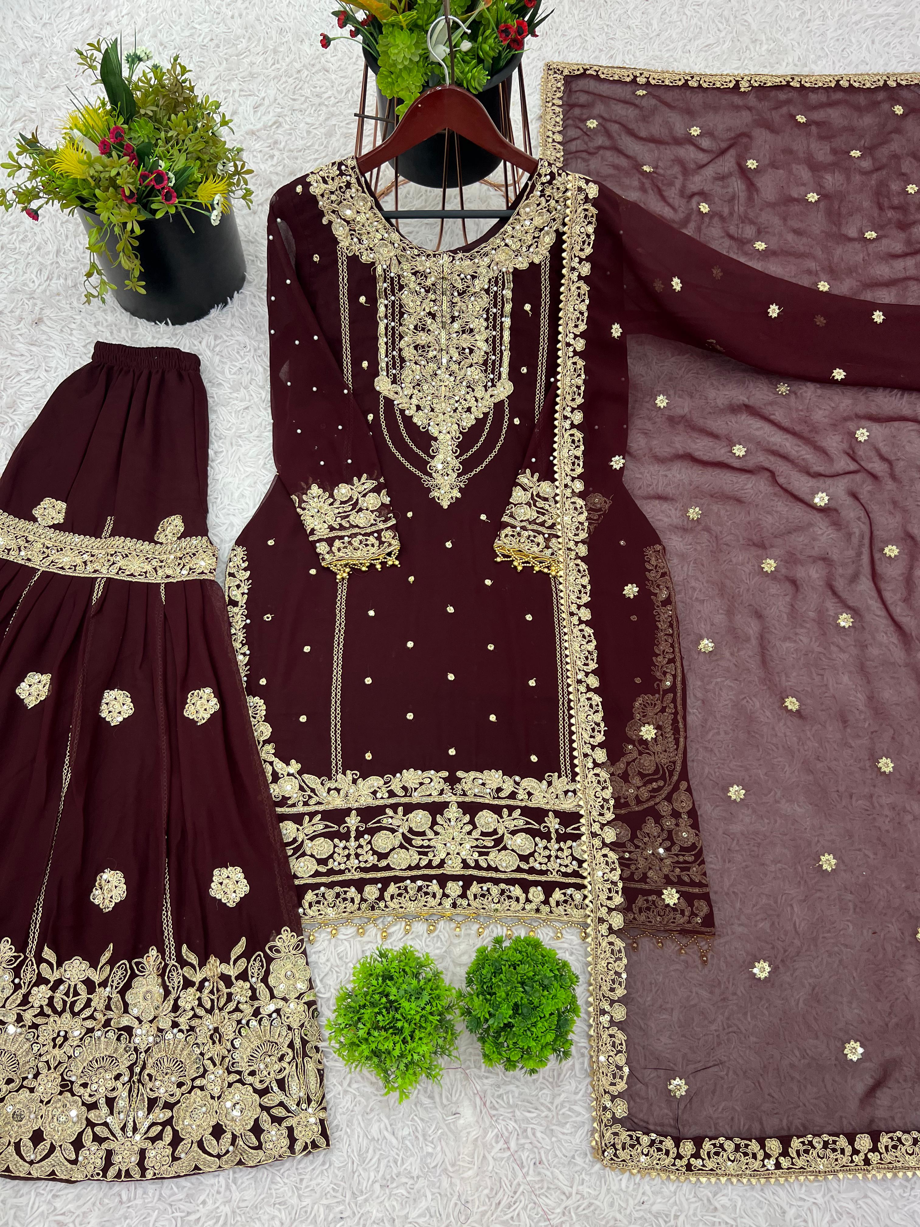 Upgrade your ethnic wardrobe with this Designer Heavy Faux Georgette Palazzo Suit Set, crafted with intricate embroidery, sequin detailing, and rivet moti work. This fully stitched, ready-to-wear outfit is the perfect choice for weddings, festive occasions, and parties, offering both elegance and comfort.