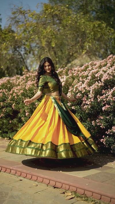 Green & Yellow Kanchipuram Silk Lehenga with Zari Weaving and Georgette Dupatta