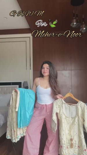 Step into elegance with the Loomeera Ivory Sharara Set, adorned with delicate sequin embroidery on both the kurti and sharara. The back dori with playful tussles adds charm, while the vibrant cyan dupatta with embroidered borders brings a perfect pop of color. This ensemble blends sophistication with festive glamour—ideal for weddings, parties, and cultural gatherings.
