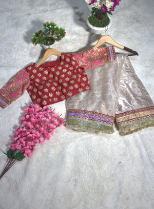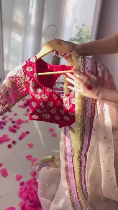 Make a show-stopping entrance in this luxurious Jimmy Choo saree, a masterpiece adorned with multi-sized sequins (3mm, 5mm, 9mm), intricate zari, and delicate dori work. Designed to shimmer with every movement, this saree exudes unmatched glamour and elegance. ✨