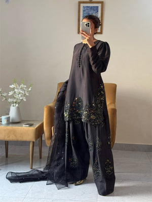 Black Natural Crep Silk Embroidered Top, Farshi Pant & Dupatta Set – Ready-to-Wear Party & Wedding Ensemble