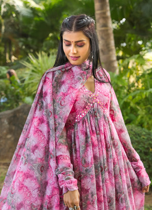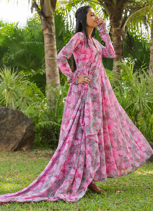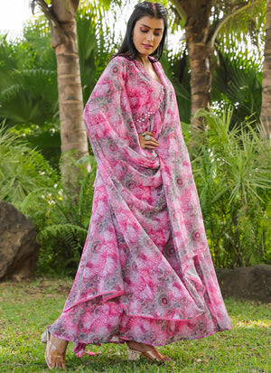 Turn heads in this Pink Floral Printed Georgette Gown, crafted in a graceful tiered design with a modern round back cut-out detail. The gown features a flattering V-neck, full sleeves, and flowing flared silhouette, making it a stunning choice for festive gatherings, weddings, or evening parties. Complete with a matching 2.25mtr dupatta, this outfit perfectly blends tradition with trend.