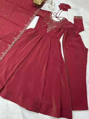 Add a fresh and regal charm to your festive wardrobe with this Premium Romanshimmer Chanderi Silk Anarkali Set. Crafted from high-quality pure shimmer chanderi silk, this fully stitched ready-to-wear outfit includes a 4-meter flair Anarkali gown, matching pant, and an elegant dupatta embellished with handwork beads, zari embroidery, and a fancy border. Designed for both comfort and style, this ensemble is perfect for weddings, receptions, and festive celebrations.