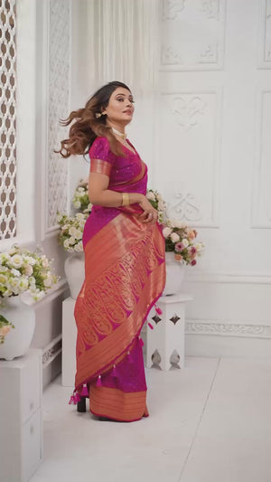 Step into elegance with this luxurious soft silk saree, designed for comfort, style, and festive charm. Crafted from silky smooth, lightweight fabric, it features intricate all-over weaving buttis, a stunning woven zari border, and a rich pallu that adds a regal touch.