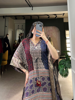 Pure elegance in every drape. ๐ค This pure viscose kaftan is elevated with real mirror handwork and a delicate zari border, making it a perfect blend of luxury and comfort. With its free-size design (adjustable up to 44"), it offers effortless grace and a relaxed fit for all-day wear. Ideal for festive gatherings, evening parties, or a classy casual look.
