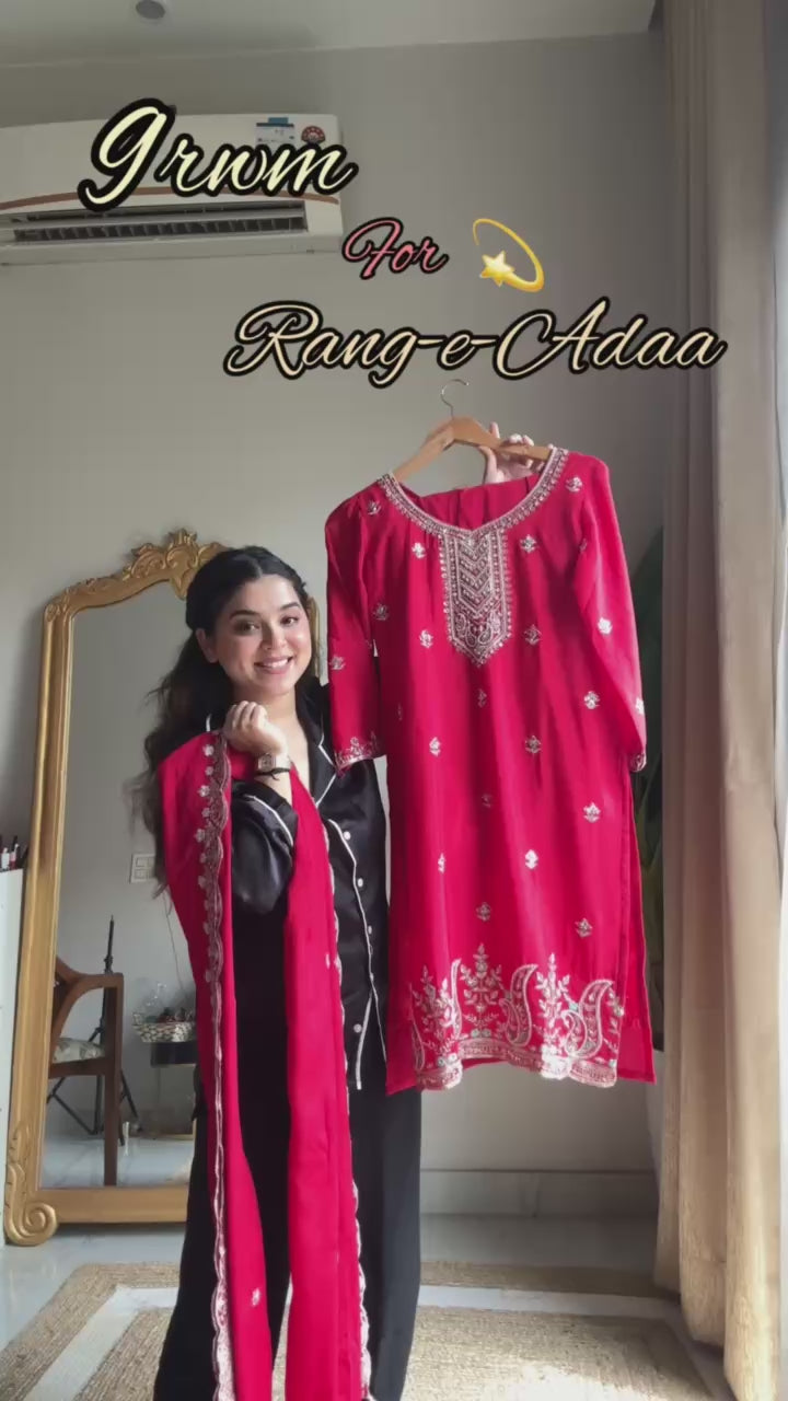 Step into elegance with this premium Chinon Palazzo Set from Loomeera, beautifully crafted in the timeless combination of red & white. The kurti, salwaar, and dupatta are adorned with intricate beads and sequence embroidery, making it a perfect choice for festive celebrations, weddings, and parties. Every detail radiates sophistication—because every step deserves a touch of Adaa. 💫