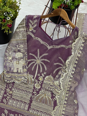 Presenting the new designer collection in premium Twill Net, crafted with heavy embroidery and sequins work. This ready-to-wear set includes a fully stitched top, palazzo, and matching dupatta, making it effortless to dazzle at weddings, parties, and festive occasions. With its intricate detailing, elegant silhouette, and high-quality fabric, this set is designed to make every celebration memorable.